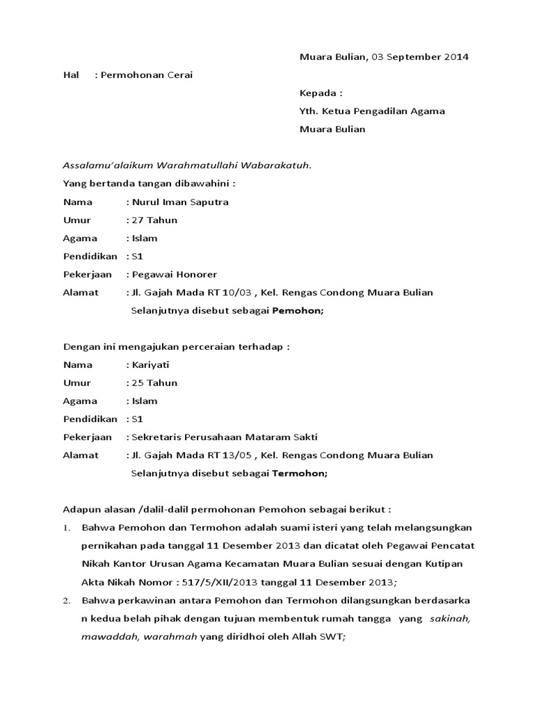 Format Contoh Surat Permohonan Cerai Talak Suami Yang Mengajukan Permohonan Cerai